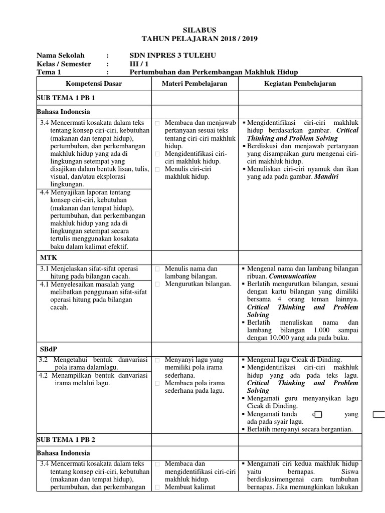 Silabus pai dan bp kelas 1 2 3 4 5 6 sd/mi k13 revisi 2018. Silabus kelas 1 sd k13 semester 1. Download silabus k13 sd kelas 1, 2, 3, 4, 5, 6 semester 2 dan 1. Silabus pai sd k13 revisi 2018 kelas 1. Silabus yang kami bagikan merupakan kumpulan silabus jenjang sd/mi mulai dari kelas 1, 2, 3, 4, 5, dan 6.
